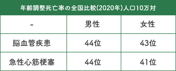 実際に、茨城県で脳血管疾患や、急性心筋梗塞で亡くなる方は、全国で41位~44位になるなど、高血圧などを要因とした生活習慣病による死亡率が全国に比べて高くなっています。