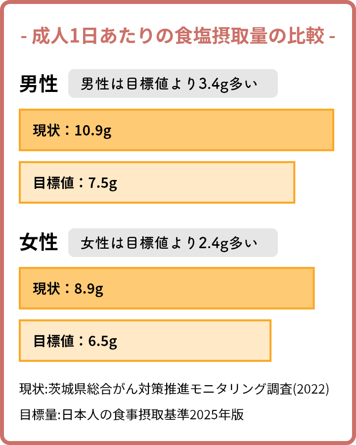 茨城県民は、高血圧の要因となる食塩摂取量が目標量を上回っているのが現状です。